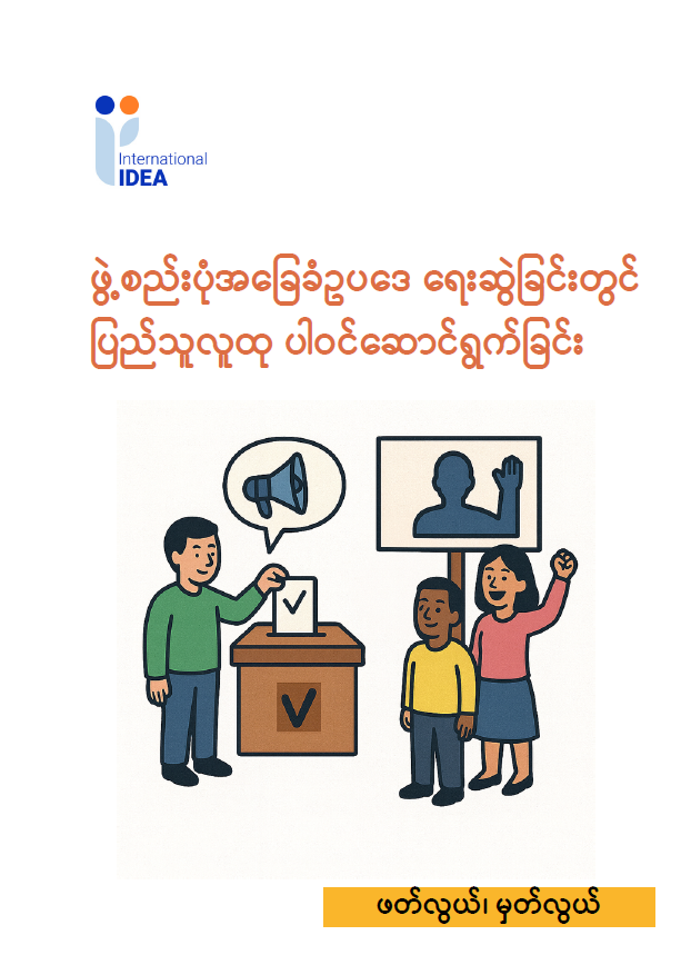 ဤစာအုပ်သည် International IDEA မူဝါဒစာတမ်း အမှတ် ၂၄ ဖြစ်သည့် "ဖွဲ့စည်းပုံအခြေခံဥပဒေ တည်ဆောက်ကျင့်သုံးခြင်းတွင် ပြည်သူလူထုပါဝင်ဆောင်ရွက်ခြင်းအတွက် လက်တွေ့ကျသော ထည့်သွင်းစဥ်းစားချက်များ - ဆောင်ရွက်ချက်၊ ဆောင်ရွက်မည့်အချိန်၊ ဆောင်ရွက်မည့်နည်းလမ်းနှင့် ဆောင်ရွက်သည့်အကြောင်းရင်း” ကို ဖတ်လွယ်၊ မှတ်လွယ်ပုံစံဖြင့် ရေးသားထားခြင်း ဖြစ်ပါသည်။