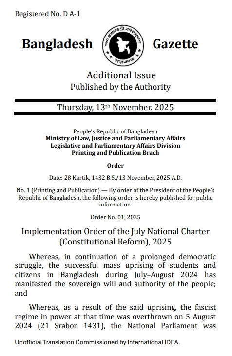 Implementation Order of the July National Charter 2025 of Bangladesh. This is an unofficial translation commissioned by International IDEA.